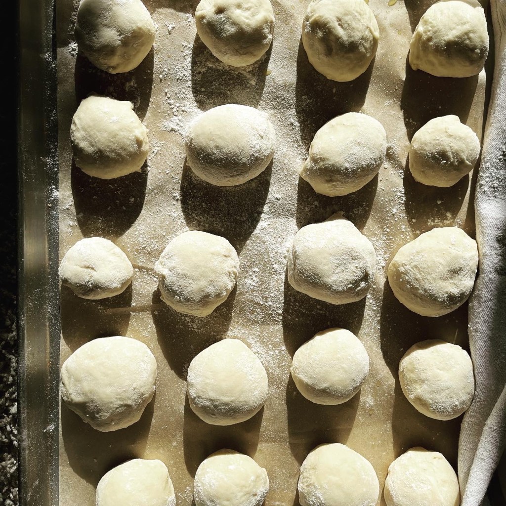 Then form into 50 gram balls (golf ball size). Roll each ball in flour.