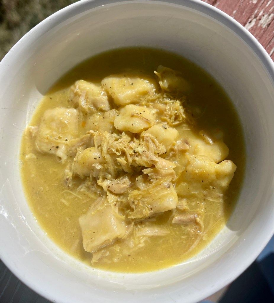 Bring the broth up to a boil and drop the dumplings in and try to minimize how much flour is transferred. When all the dumplings are in the broth, turn down to low. Add the chicken. If the soup is too thick just add water. Season with black pepper, a dash of cayenne, and 1/2 tsp turmeric. Taste and salt to preference. When reheating will need to add a few tablespoons water, the dumplings will soak up the broth.